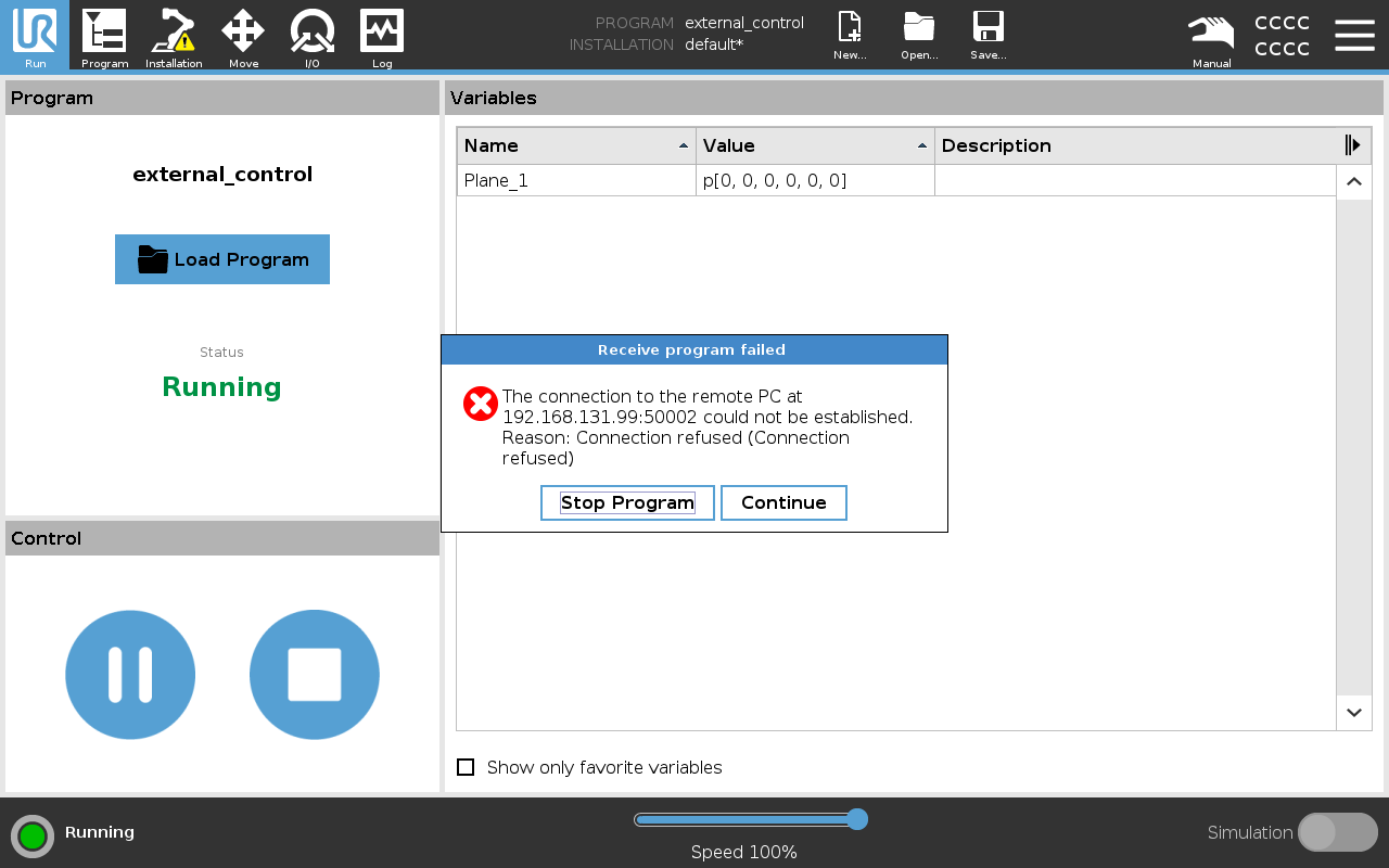 If the following error pop-up window appears, then ensure that the arm's URCap configuration matches the robot's computer and that the robot's computer is able to ping the arm. The error also indicates that the ROS driver is not currently running or has been stopped. Restart the clearpath-manipulators.service and try again: