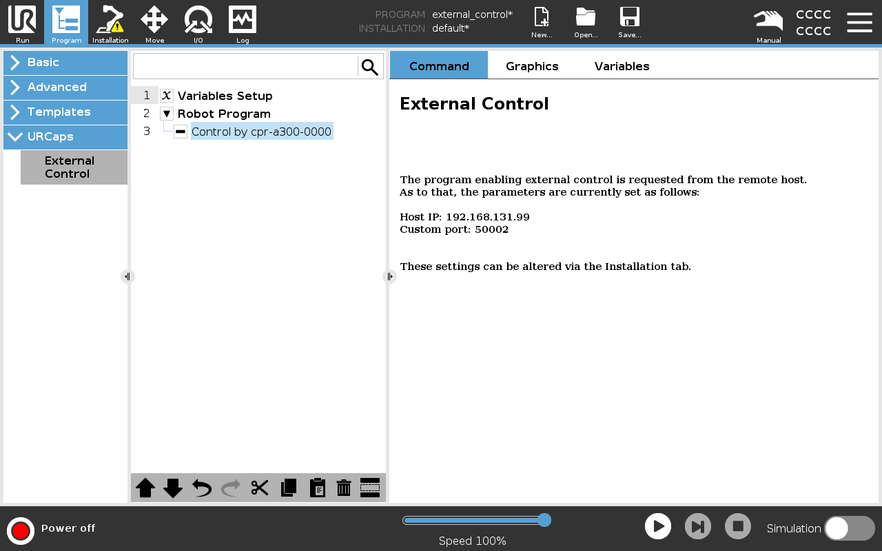 Once the URCap has been installed and configured, a program that launches the ExternalControl task needs to be created and set as default.