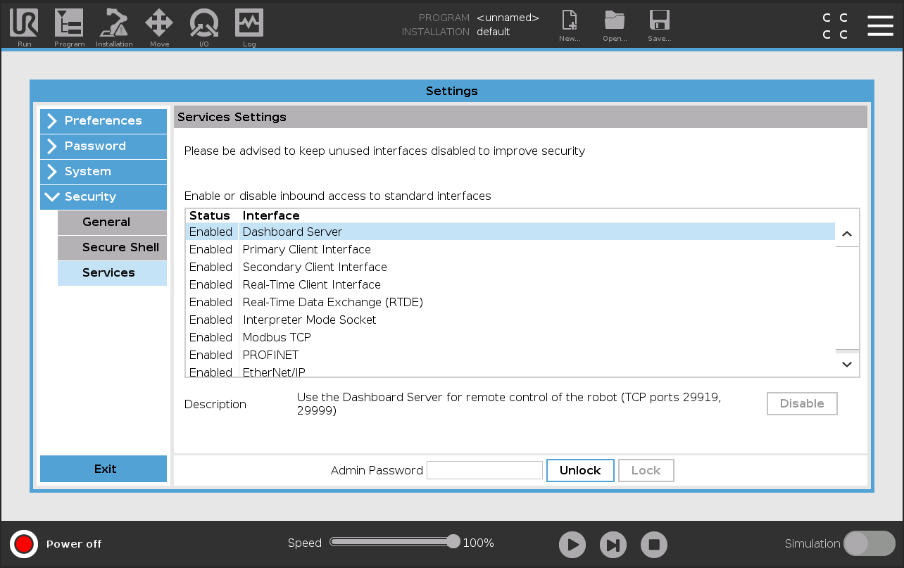 Now, set the program as default so that it is automatically loaded and ready to run on start-up. Navigate to the Installation/General/Startup page and set the external_control.urp program as the default: