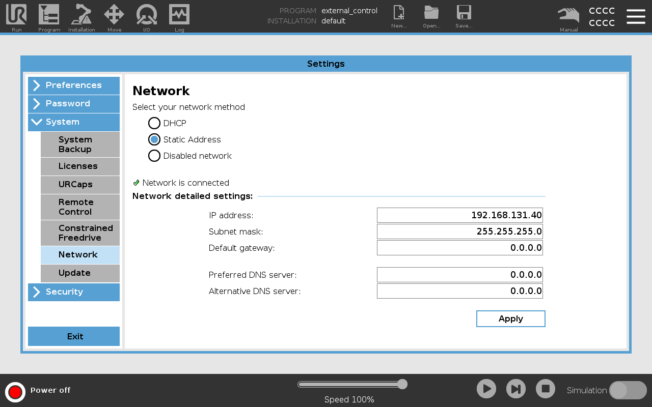 Navigate to the Settings/System/Networking page of the UR teach pendant and set the following: