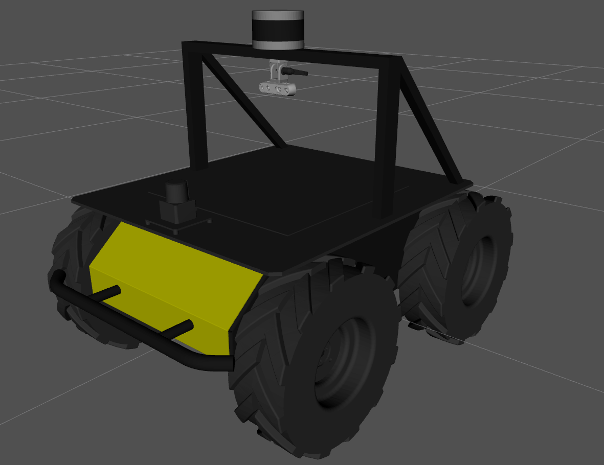 Below is the sample Husky A200 robot YAML of the robot displayed above. In the following sections, we will reference each and every component of this sample file, and show how to robot looks as we build it up.