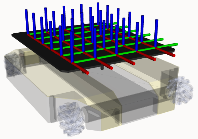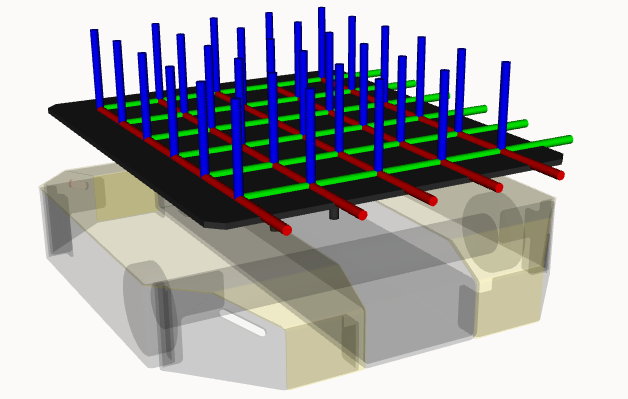 Attach accessories to the top plate mounts by setting the accessory's parent parameter to one of the grid mounting locations displayed above. The grid mounting locations span from top_plate_mount_a1 to top_plate_mount_e6, where the front left-most location is the a1 mount and the bottom right-most location is the e6 mount. The letters correspond to the columns and the number to the rows. The name of these links depends on the name parameter defined in the entry above.