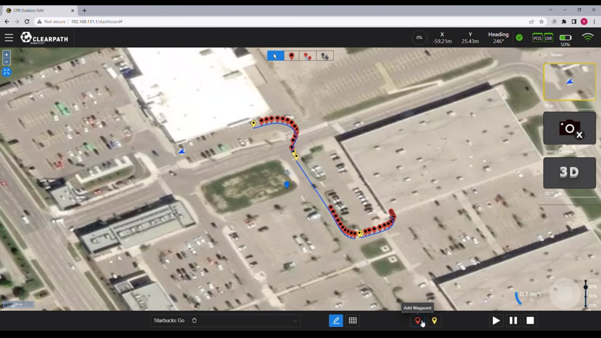 - A two Waypoint mission where the first Waypoint is located on the robot, and second Waypoint about 10-20 meters directly in front of the UGV. This will verify the requried linear motion of the UGV.