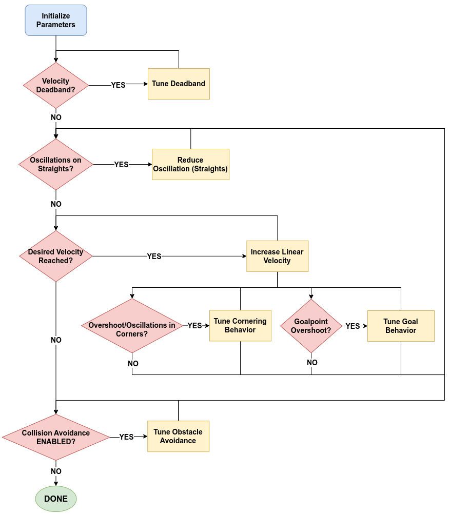 When attempting to tune the navigation controller, it is recommended to follow the following flowchart. Begin with setting up Initial Parameters for your UGV.