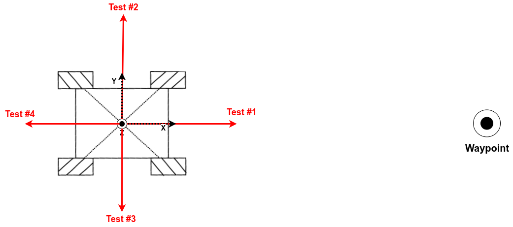 To verify the amount of oscilations around the reference path, the user should set up four missions, each of which should pass (or fall within the users requirements) prior to moving on from this section of the tuning. The start and end points of each of the tests should be identical and the start position (XY) should be noted/marked on the testing area. The first Waypoint should be placed on the robots current location and the second Waypoint should be placed 20-30m away from the start position. The four UGV orientations for each test are as follows: