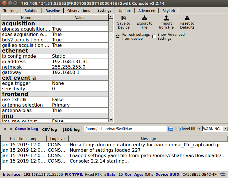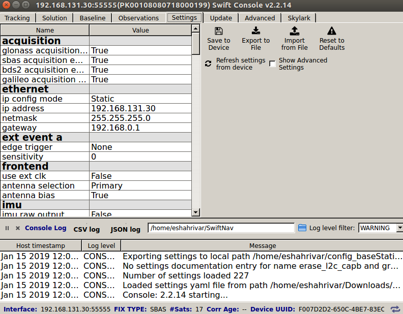 For the rest of this section, it is assumed that a third Swiftnav Duro device is available with IP address of 192.168.131.32. Note that in order to change the IP address of a Swiftnav Duro, you need to use the Swiftnav console and connect to the device with the serial port.