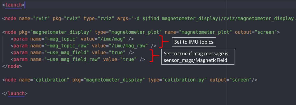 4. Open the magnetometer.launch file in the magnetometer_display package and change the sections shown in the figure below. Specifically, set use_mag_field to true when the IMU is outputting magnetometer measurements with a sensor_msgs/MagneticField message, otherwise set to false. Microstrain is the only IMU which uses the MagneticField message type.