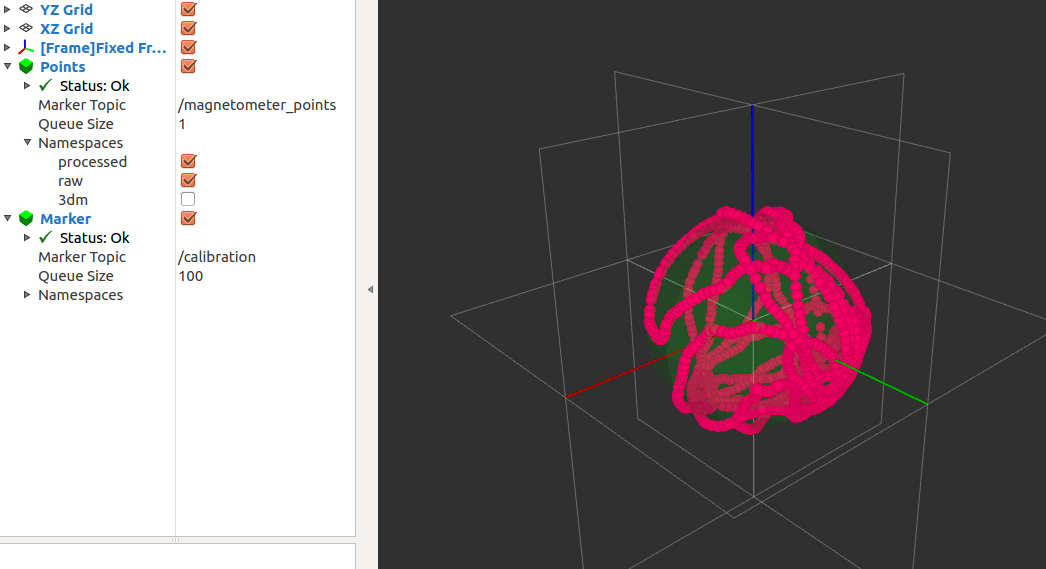 6. Move the IMU around to get good coverage. RViz will display magnetometer points (red) and will plot current ellipsoid fit (green) as shown in the figure below.