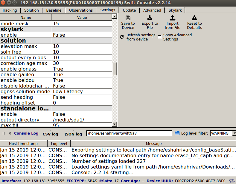 Use the Swiftnav console to connect to the Reference Receiver (with IP address of 192.168.131.31) and insert the settings shown in the figure below.