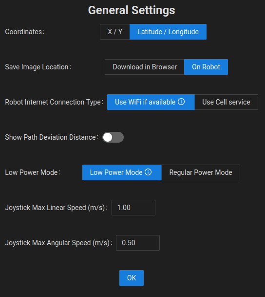 The General settings section can be found in through the upper left hand menu and allows the Operator to modify general features of the UGV.