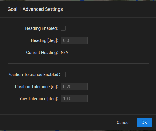 When creating a Mission, the Operator has the option of setting a specific tolerance for each Goalpoint. By default, the Goalpoint position and orientation tolerances are 0.3 meters and 180°, respectively. If a specific Goalpoint requires that the tolerances be either increased or decreased, these values can be modified in the advanced settings. For example, if it's required that the position and/or orientation at a Goalpoint be very accurate, such as 0.1 meters position and 5° orientation, or looser at 1.0 meter position, this can be done within these settings.