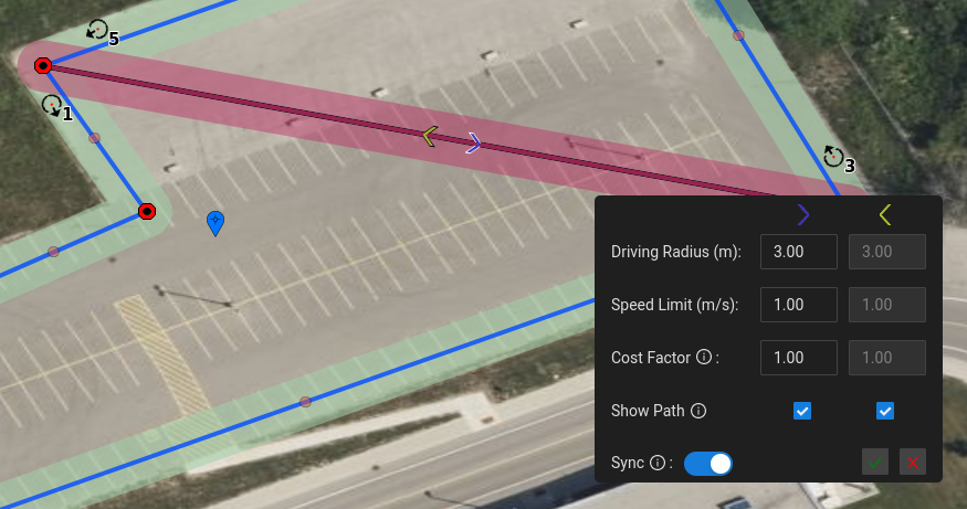 As paths are added they will be visible in the Map properties table, along with their relevant details. To edit a path's details an Operator can simply right click on the path or select the gear icon for the specific path in the table. This will open an overlay on the map that will allow the Operator to edit both one-way paths and two-way paths. In the case of two-way paths users can keep both ways in sync with each other or vary the properties depending on the direction.