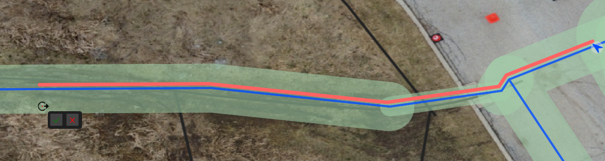 When a Map has been created a user can right click on a path or a path's driveable area to place a GoToPoint. This point will be a single point that will also create a small overlay to allow users to start or cancel the "Go To" execution. Before starting the execution the GoToPoint can be dragged to any driveable area or rotated using the CTRL key just like with Goalpoints.