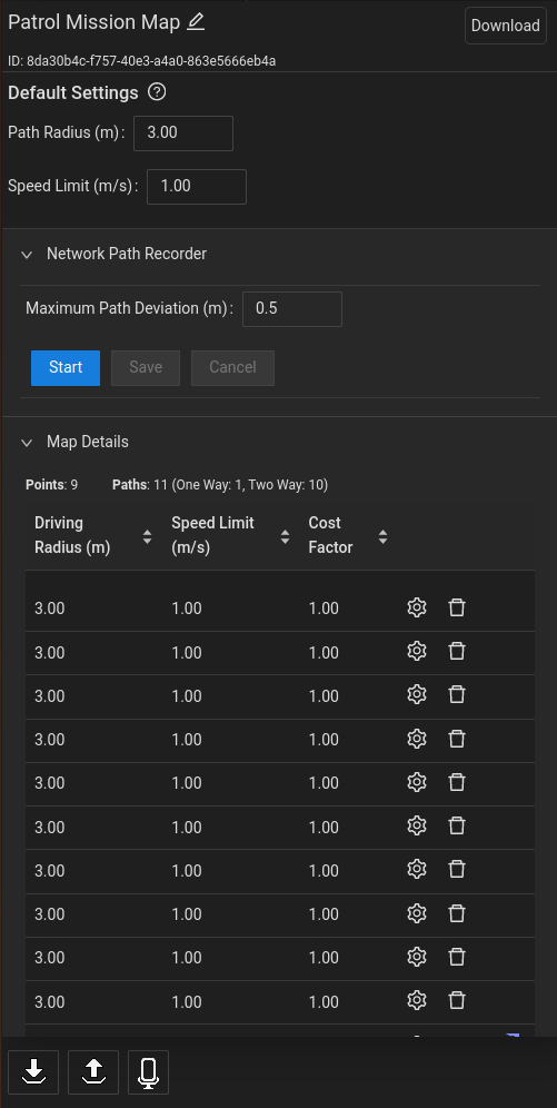 The general map details includes the total number of points as well as a table that highlights each path within the map. Operators can delete paths or edit paths through this table as needed. If a path is one-way it will show a directional arrow next to it. Two-way paths are shown as a single row unless they are out of sync regarding their cost factor, speed limit or maximum driving radius.