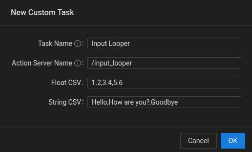 - Float CSV: A list of comma separated float values that consist of the numerical inputs to the custom task.