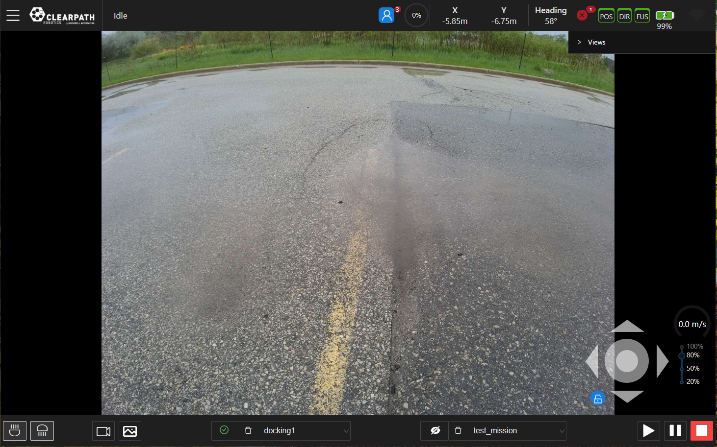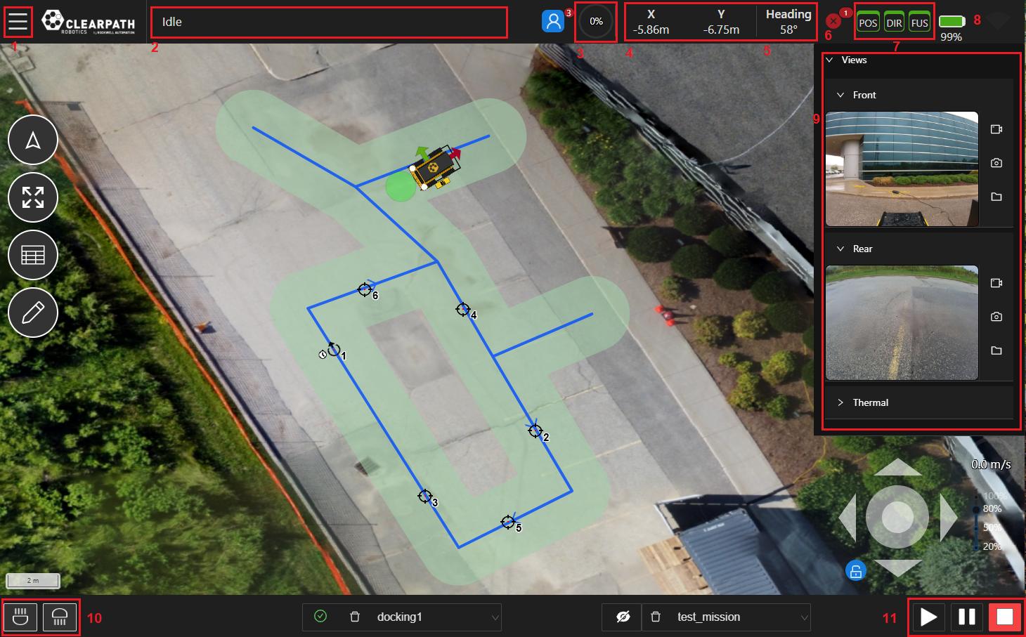 GPS Status Indicator: The GPS status indicators will display GPS signal accuracy for position (POS indicator), heading (DIR indicator), and sensor fusion (FUS indicator). Green indicators represent RTK accuracy and are currently required for accurate autonomous navigation. Yellow and orange indicators represent SBAS and SPP accuracy respectively and noticeable oscillations may occur in such cases. Red indicators mean no GPS signal and autonomous navigation missions should not be started.