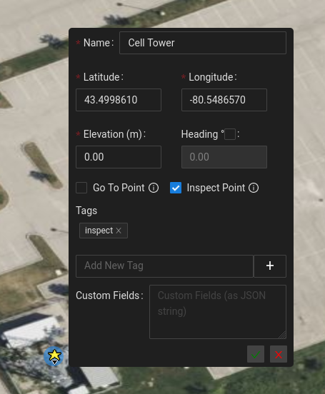 To create a POI, ensure that you are in "POI edit mode" (Hotkey, e+4). Click on the map to place your POI and assign the POI a name. You also have the ability on creation to assign a heading, tags and custom fields (all optional).