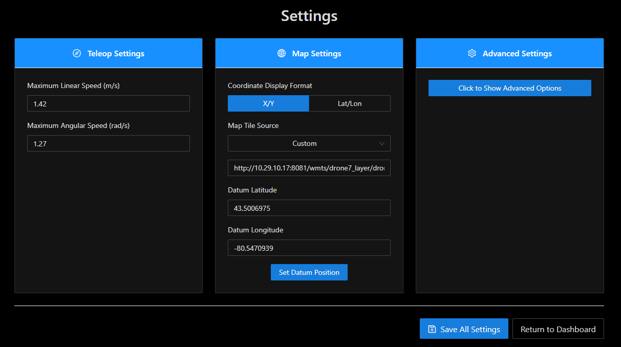 The Web User Interface (Web UI) provides an easy, graphical, means to control both manual and autonomous operation of your UGV. The following sections outline: the components and views of the UI, the details of operating in manual mode, and the details of operating in autonomous mode.