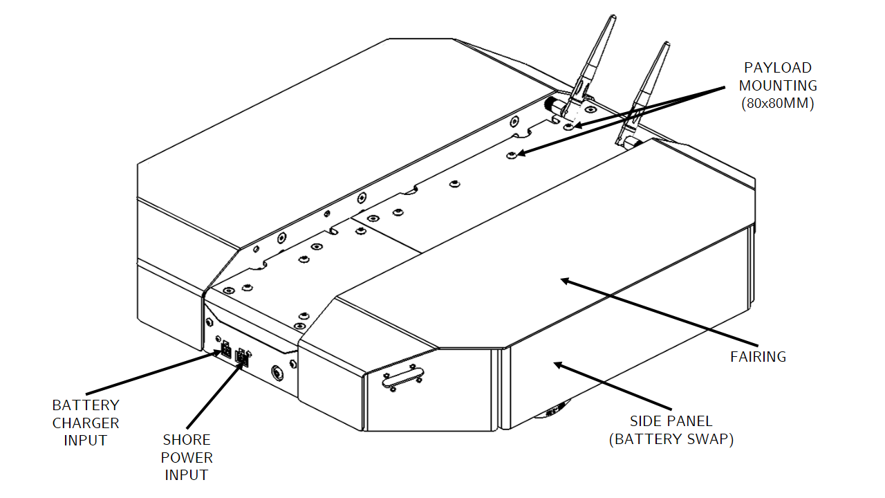 For Dingo 1.0, to connect the shore power, remove the top trough cover (to access the MCU) and then attach the shore power cable to the 2-port connector labelled "SHORE" on the MCU.