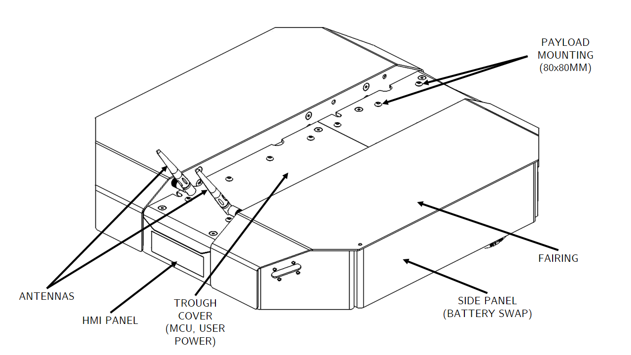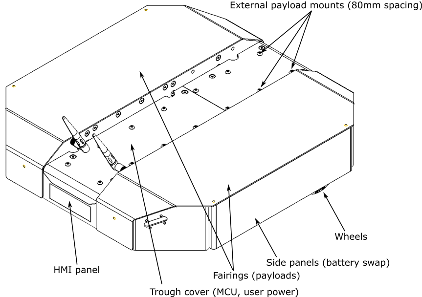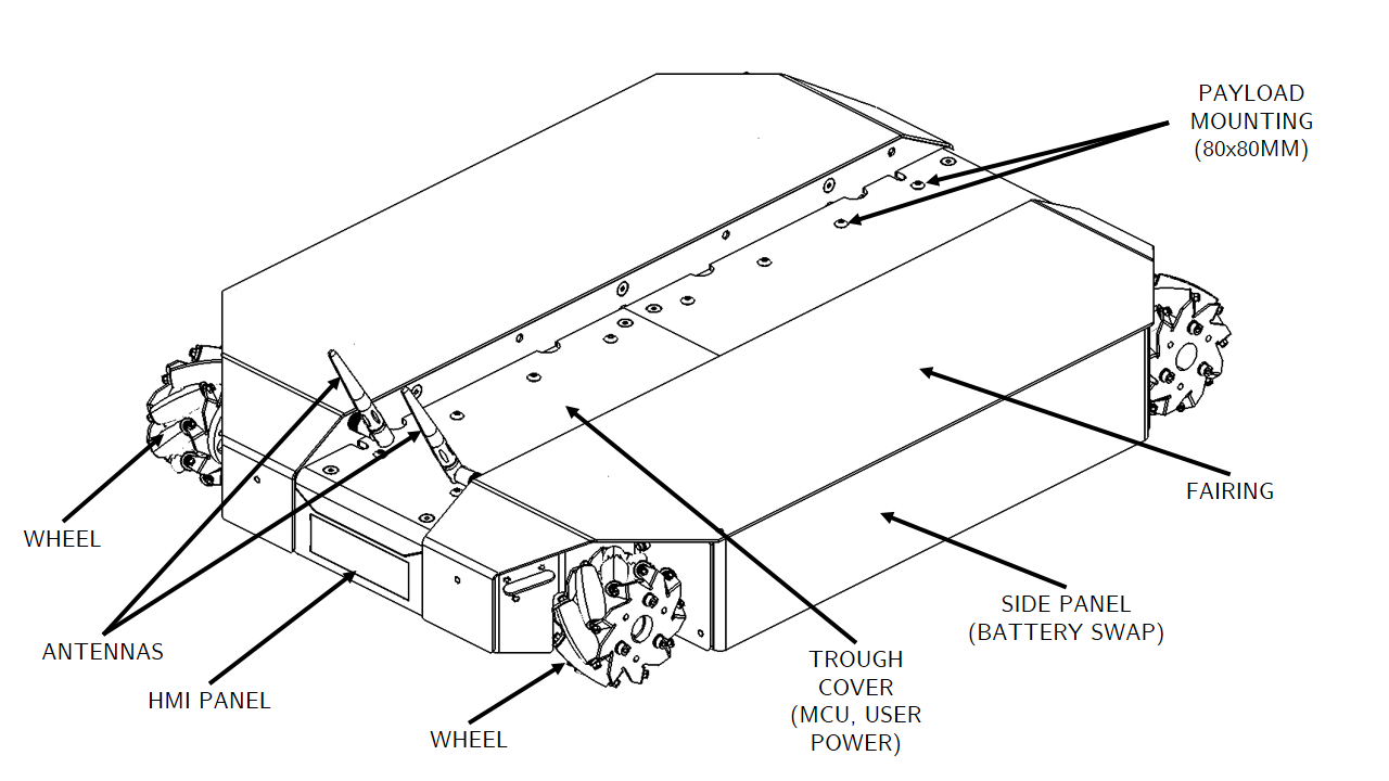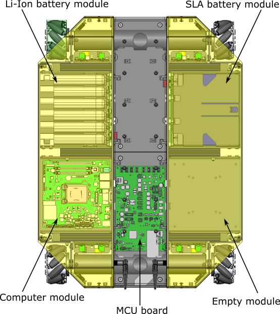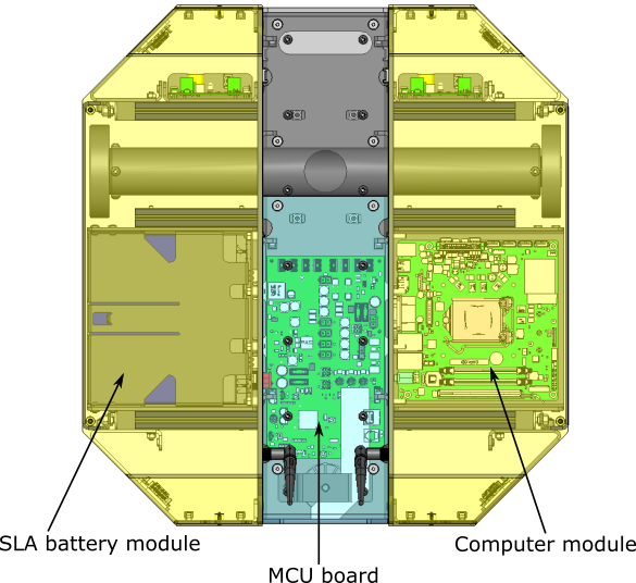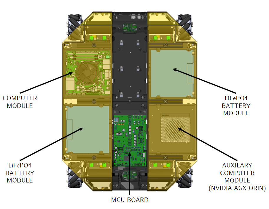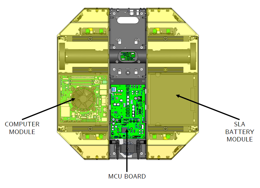 To access Dingo's payload modules (computers or batteries), simply slide and remove the top (yellow) fairings. To access Dingo's MCU PCBA (for user power), remove the four M5 flathead screws from the top trough cover, and then remove the trough cover.