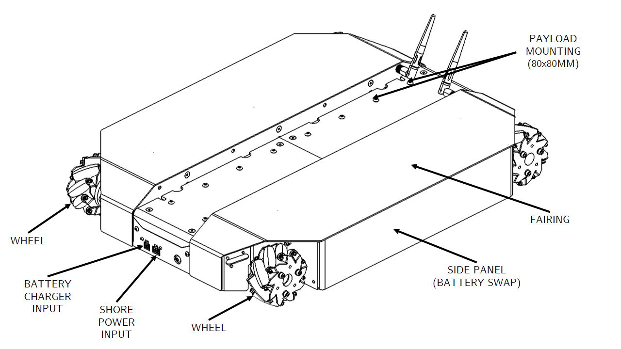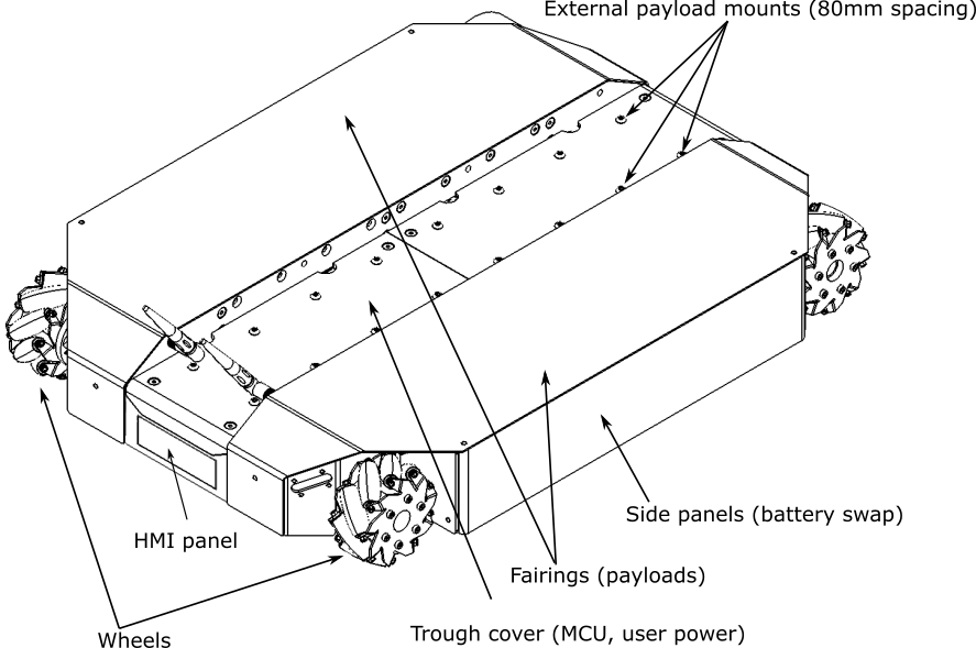 - 98.4 mm diameter wheels (Dingo-D) or 101.6 mm diameter mecanum wheels (Dingo-O);