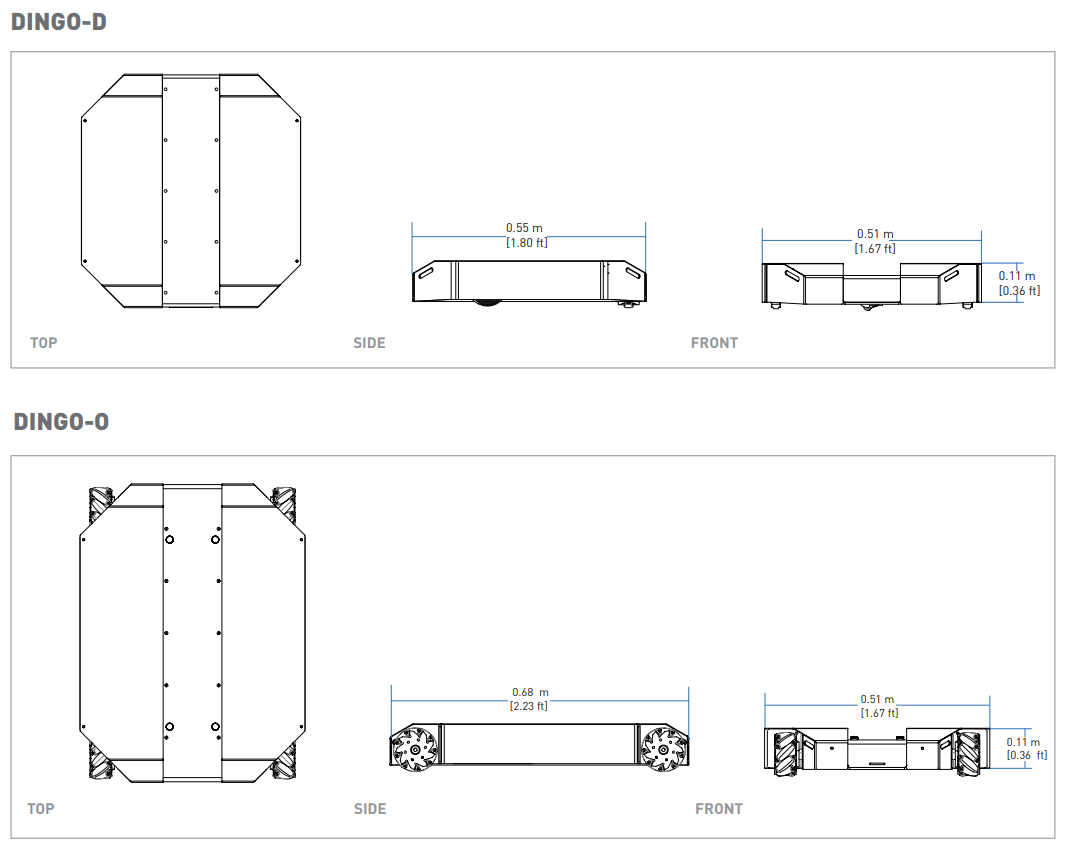 | Specification | Dingo-D (Differential Drive) | Dingo-O (Omnidirectional Drive) |