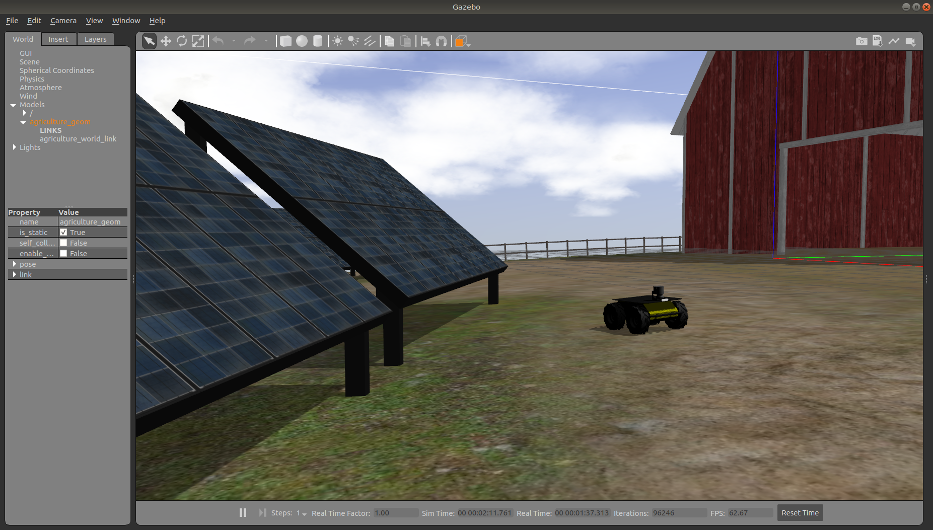 Agriculture World is a flat, mixed indoor/outdoor world that include a large barn, open fields surrounded by fences, and a large solar farm. It is intended to simulate missions such as solar panel inspection and area coverage.
