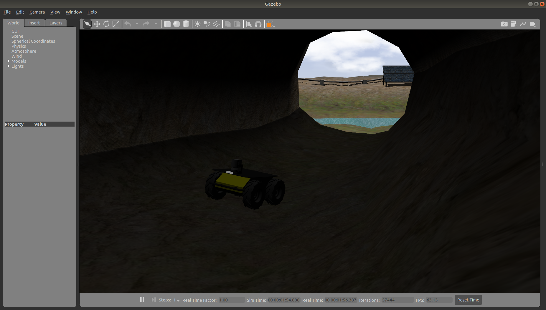 Inspection World is a hilly, outdoor world that includes a water feature, bridge, pipeline, small cave/mine, and a small solar farm. It is intended to simulate a variety of missions, including pipeline inspection, cave/underground navigation, and localization on non-planar terrain.