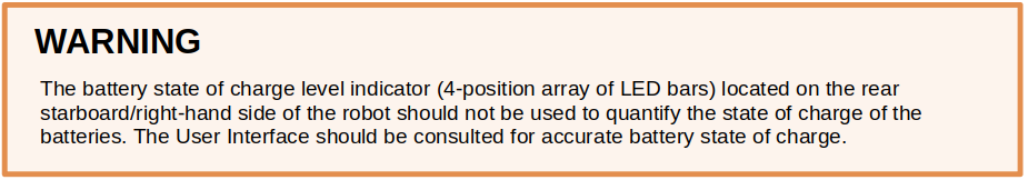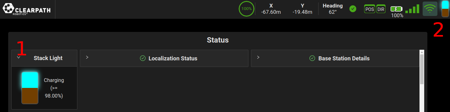 ![]() | Battery Status This is not used on Husky A200 Observer. Refer to the battery state indicator in the OutdoorNav UI or on the stack light instead. |