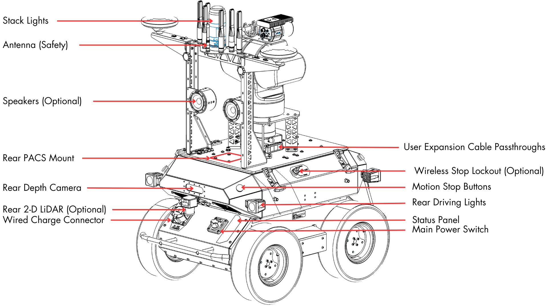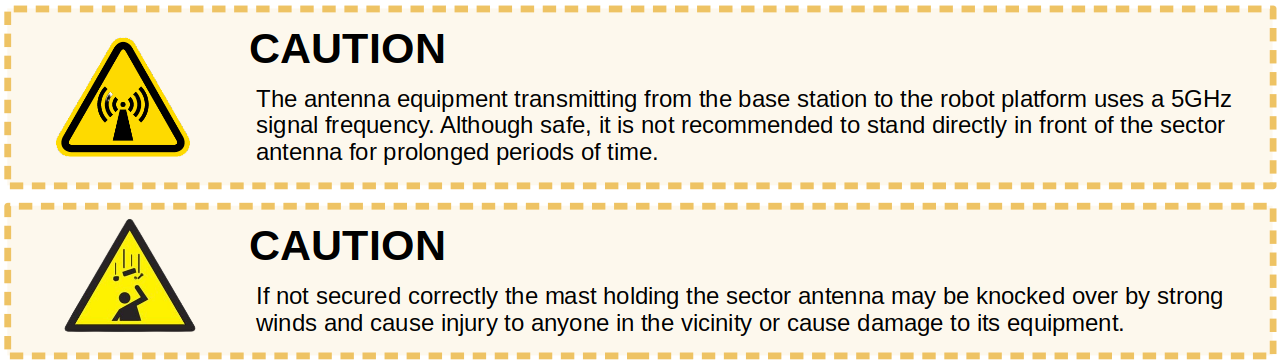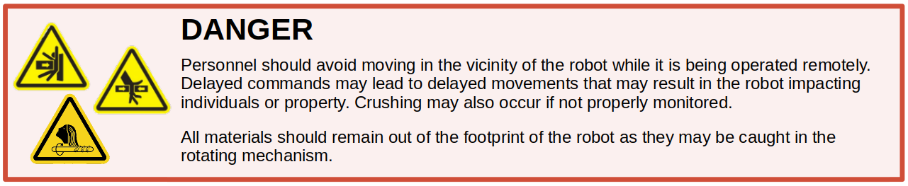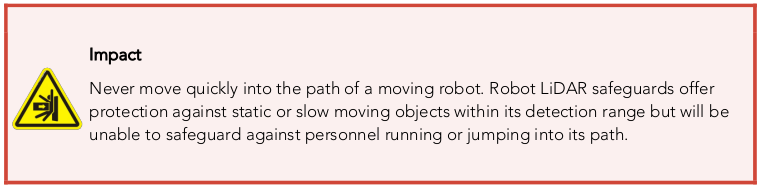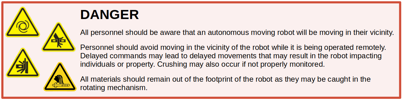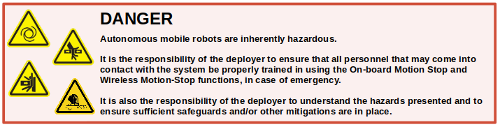 Mobile robots are inherently hazardous. It is the responsibility of the deployer to ensure that all personnel that may come into contact with the system are trained properly. It is also the responsibility of the deployer to understand the hazards presented and to ensure sufficient safeguards or other mitigations are in place. Refer to the Safety section of this manual for further details.