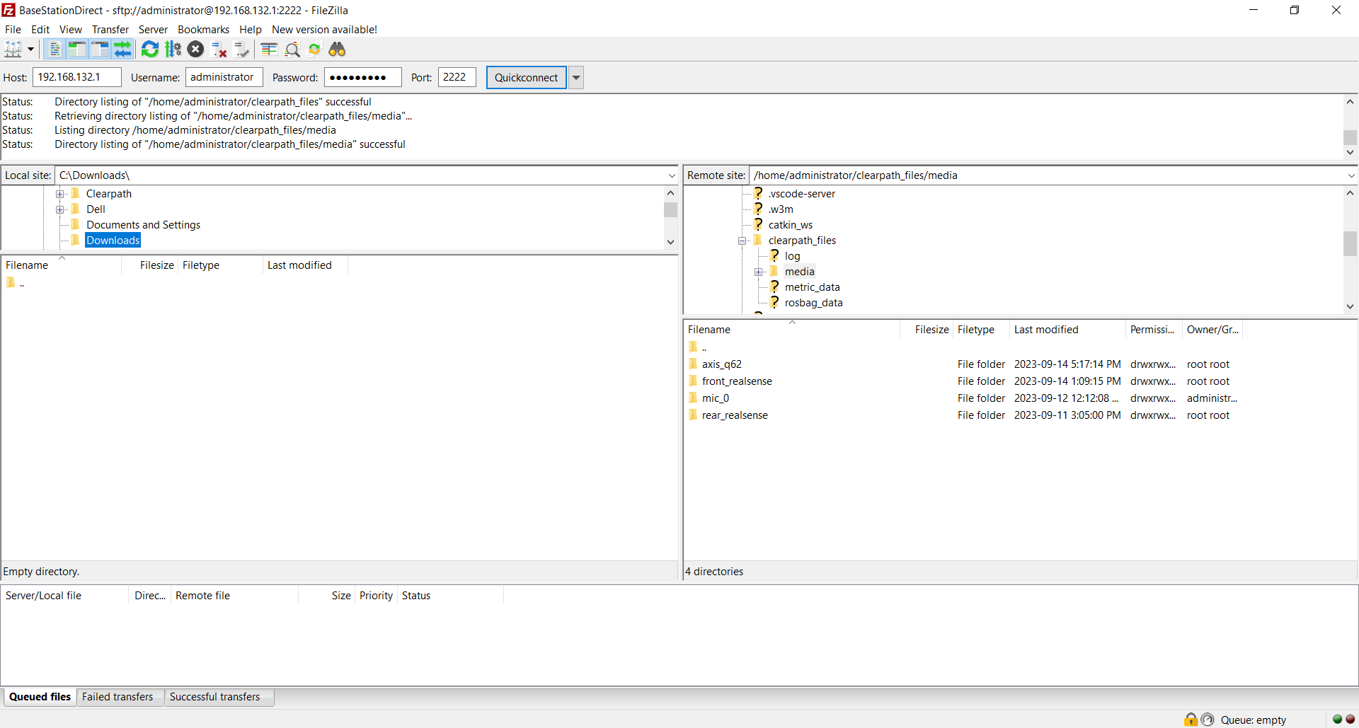 All images and videos that are collected during missions are stored on the Main Computer inside Husky A200 Observer until downloaded and deleted by the operator. When the download/delete function is performed by a computer within the Base Station network, the Main Computer can be accessed as described in the following section by connecting to TCP port 22 on the Main Computer. When the download/delete function is performed by a computer on the WAN network (connected to the Base Station WAN port), the operator can access the Main Computer by accessing TCP port 2222 on the Base Station, which gets mapped to TCP port 22 on the Main Computer.