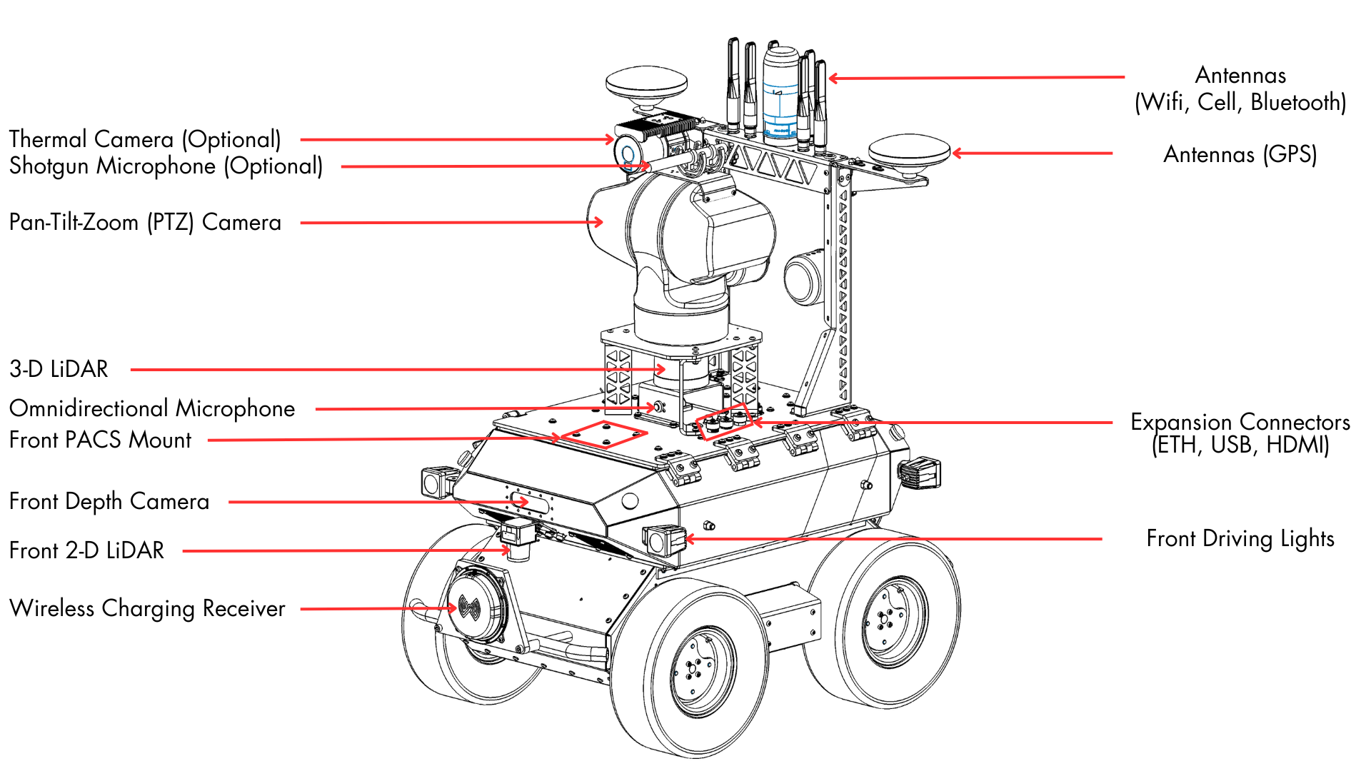 - Front (standard) and rear (optional) 2-D LiDARs