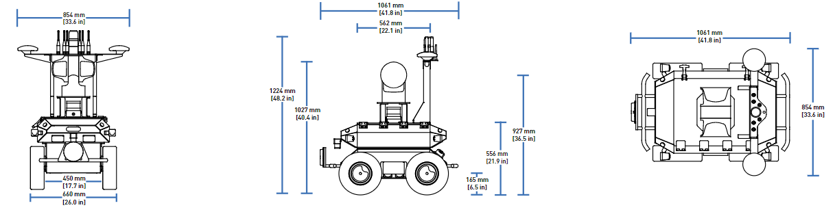 Additional payloads can be integrated with Husky A200 Observer, either as part of your purchase or installed after receiving your Husky A200 Observer. Refer to Husky A200 Observer Integration for details on how to integrate your own payload or how to integrate a payload kit from Clearpath Robotics. Each payload kit that ships from Clearpath Robotics comes with a custom mounting bracket and cabling for easy attachment to Husky A200 Observer.