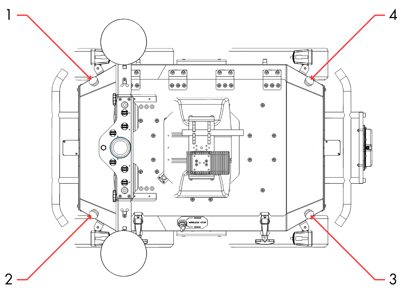 There are four motion-stop buttons on the robot, one at each of the four corners. Depressing any of these four buttons will engage motion-stop and remove power from the robot motors. Refer to the Safety section for further details.