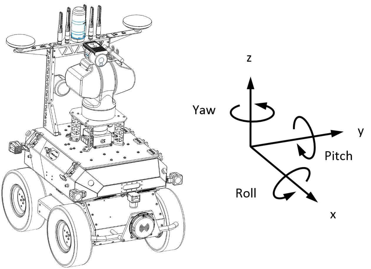 The reference frame used by all Clearpath Robotics ground robots is based on ISO 8855, and is shown in the figure below. Husky A200 Observer's front is shown. When commanded with a positive translational velocity (forward), wheels travel in the positive X-direction. The direction of the axes differs from those used for roll, pitch, and yaw in aircraft, and care should be taken to ensure that data is interpreted correctly.