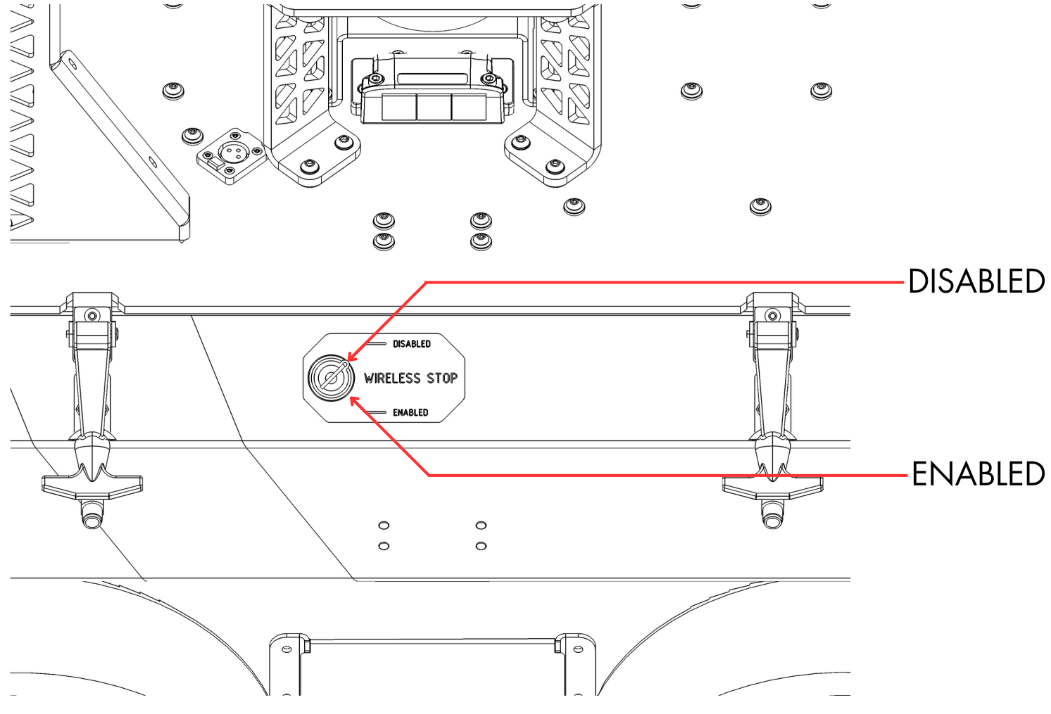 In addition to the motion-stop buttons on the robot, if your Husky A200 Observer is equipped with a wireless motion-stop function, it is possible to disable this function with the override key switch. Refer to the Safety section for further details.