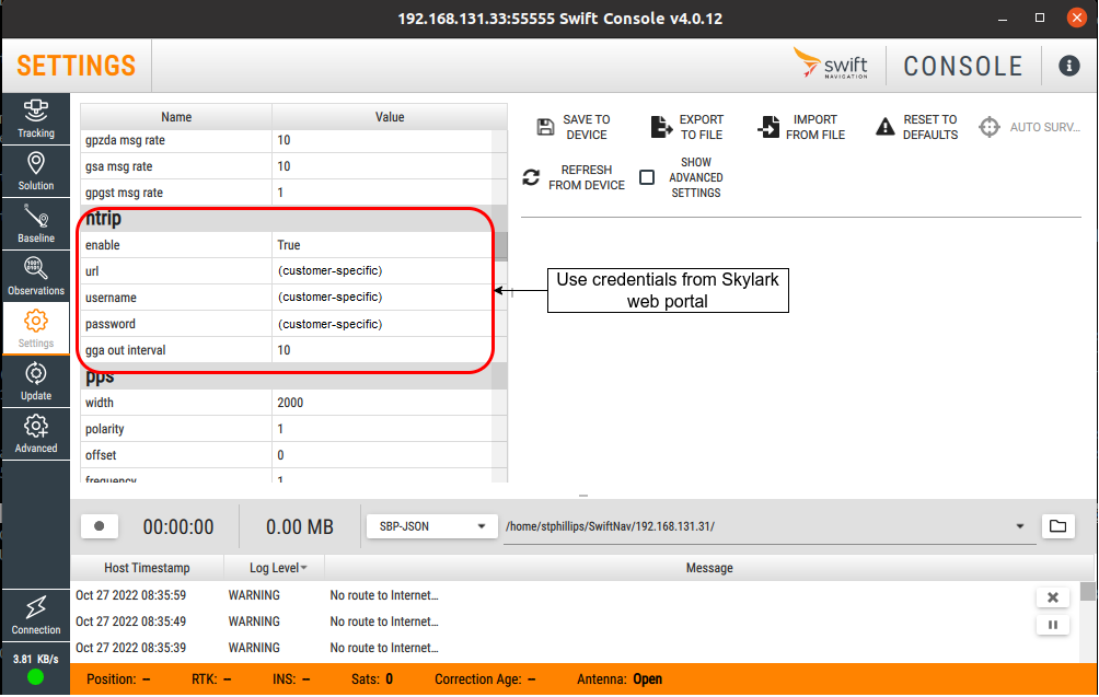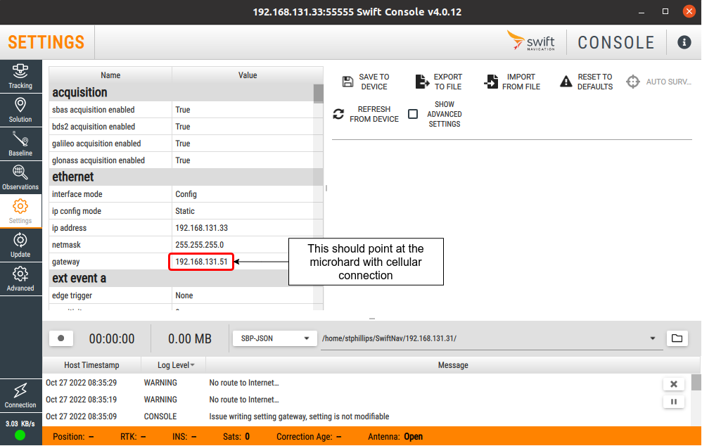 | GPS receiver, SwiftNav, Base Station (optional) | 192.168.131.30 | n/a |