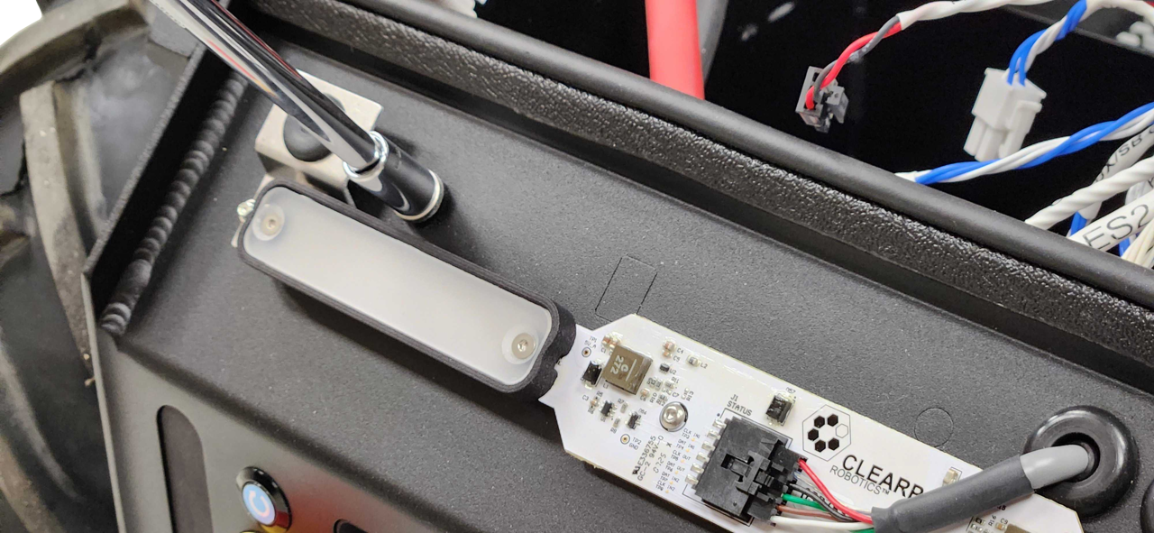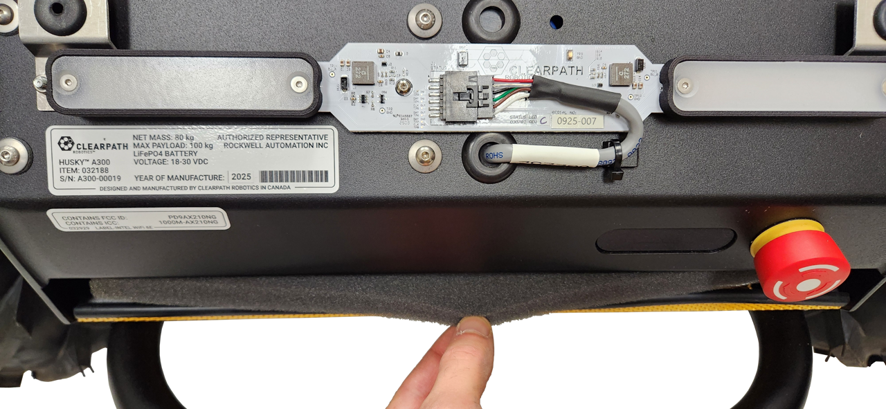 The base Husky A300 includes 2 Emergency Stop Buttons, which are connected to the System Interface circuit board. The System Interface circuit board also includes connector breakouts for 6 more Emergency Stop devices, labelled ES3 through ES8. The standard Husky A300 has a bypass jumper inserted into each of these unused Emergency Stop breakouts.
