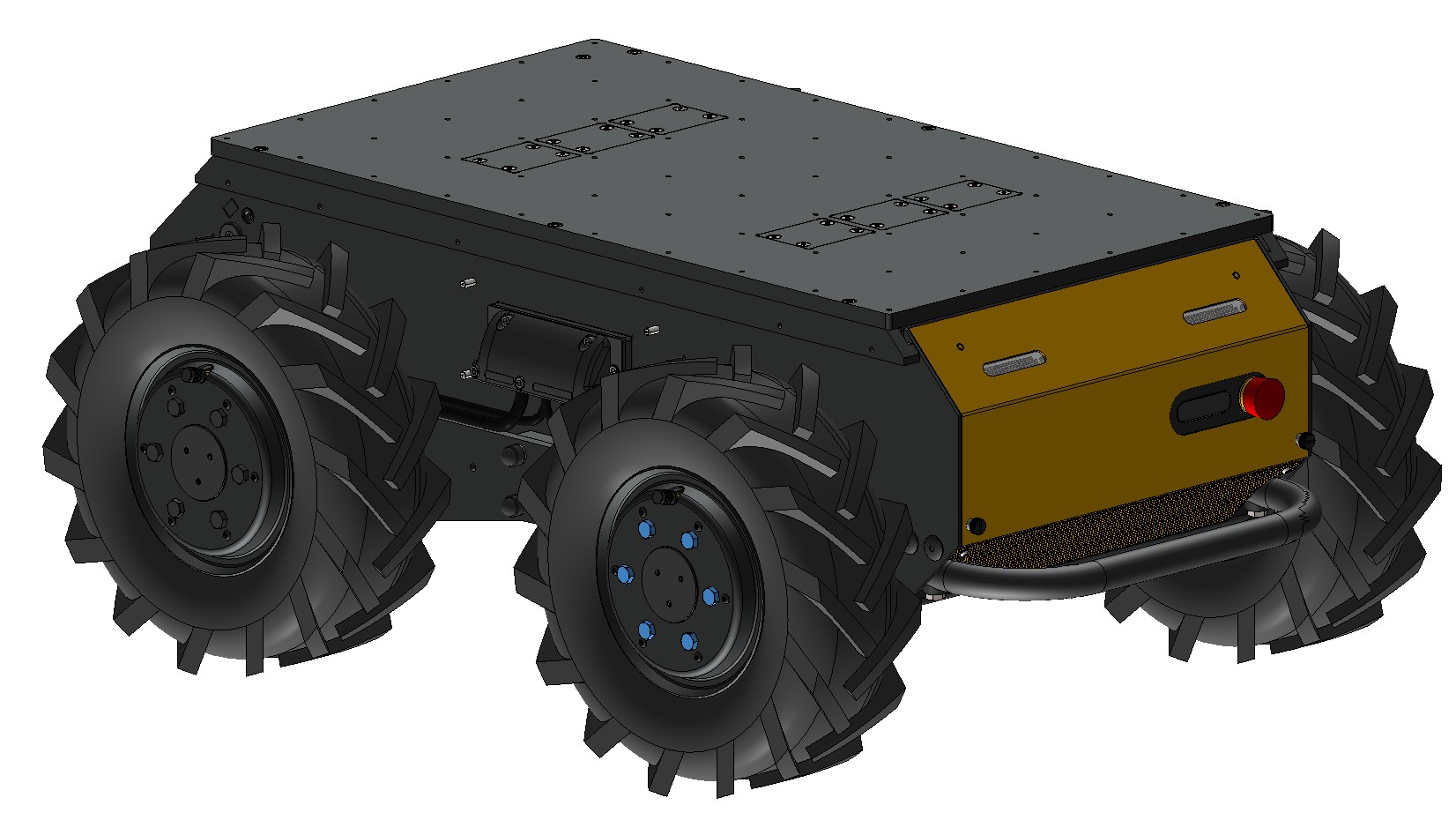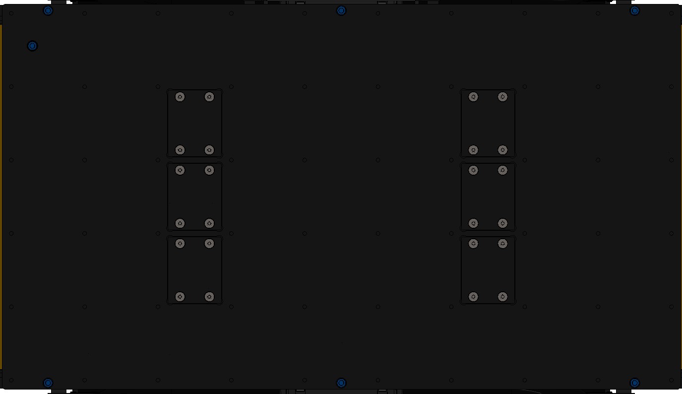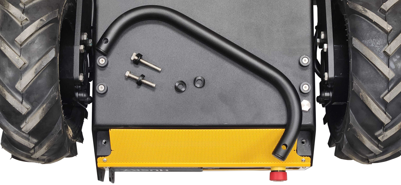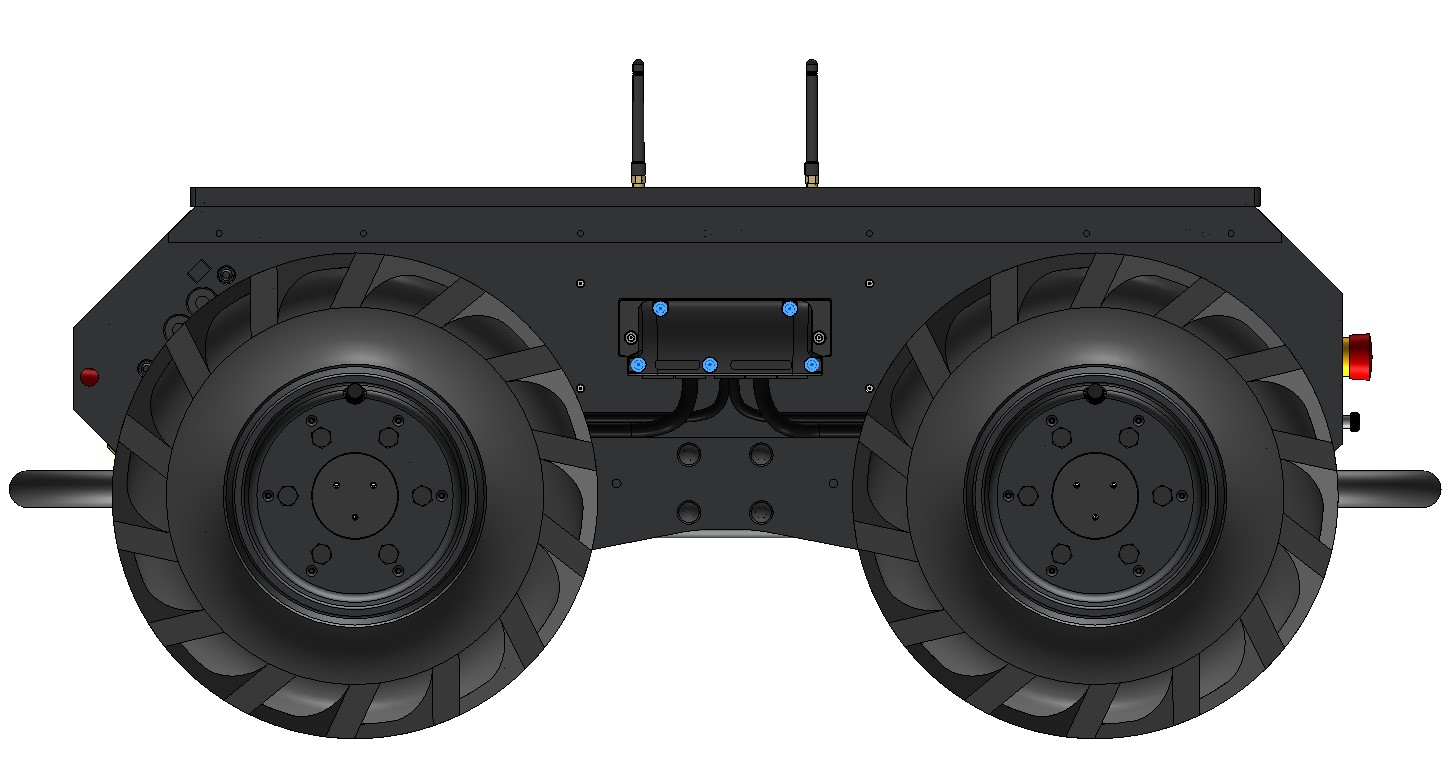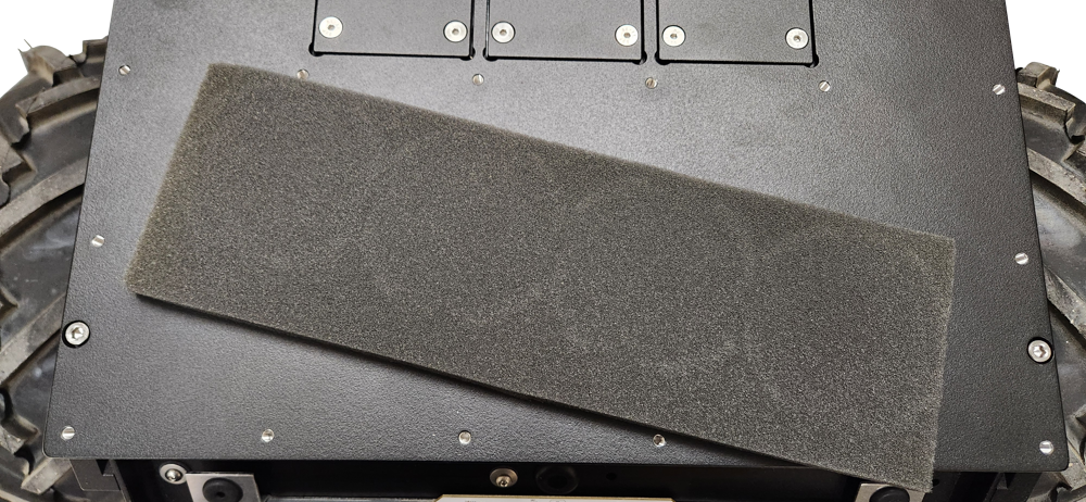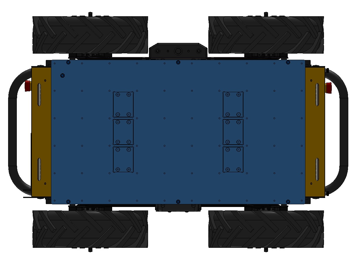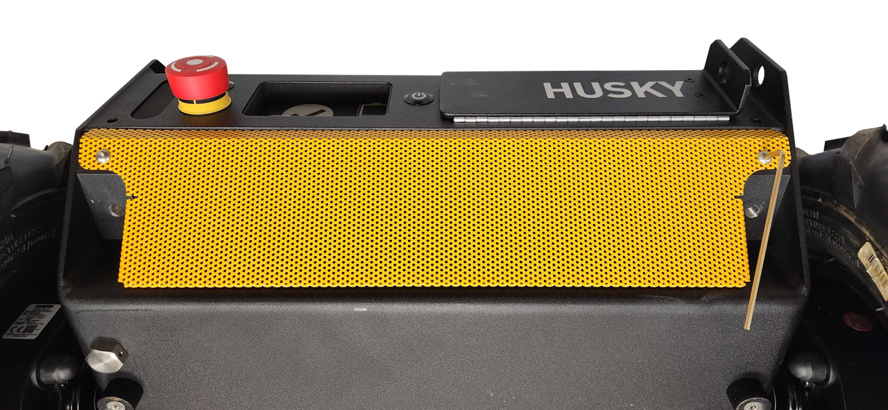 There is a grid of Ø5 mm holes on the top of the enclosure, near the front and rear edges. These holes have a pitch of 80 mm, same as Clearpath's PACS™ system. The holes are located near the enclosure's weld seams, to improve stiffness between the large component and the Husky's wheels.