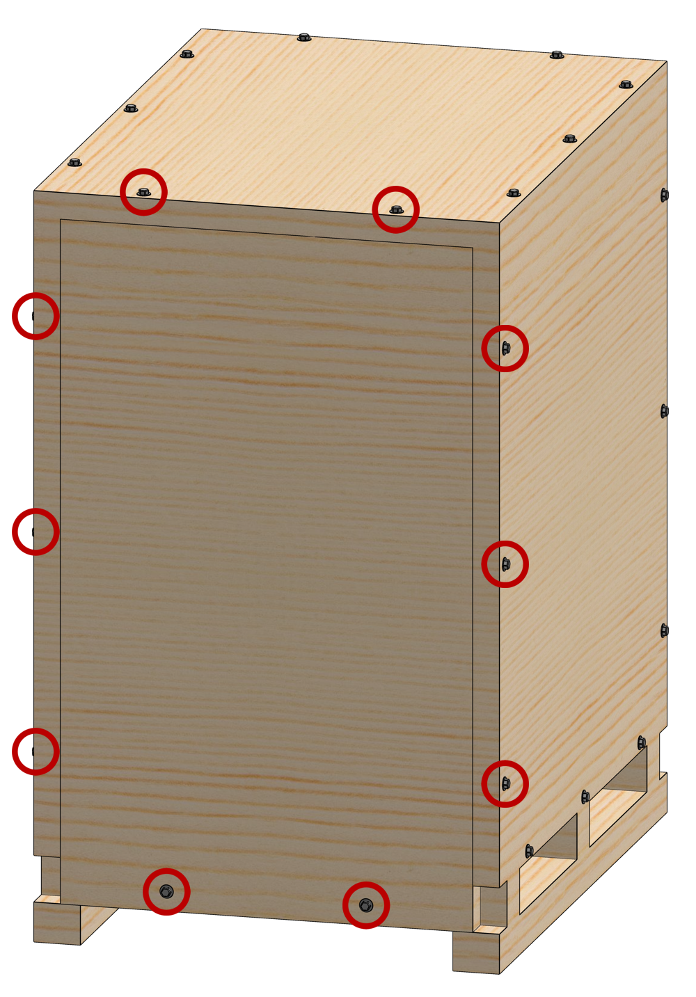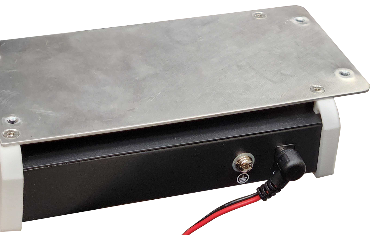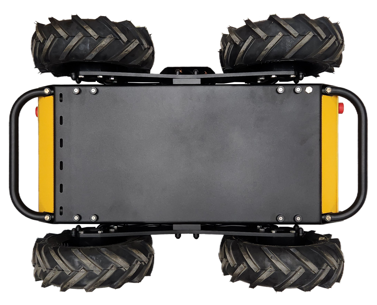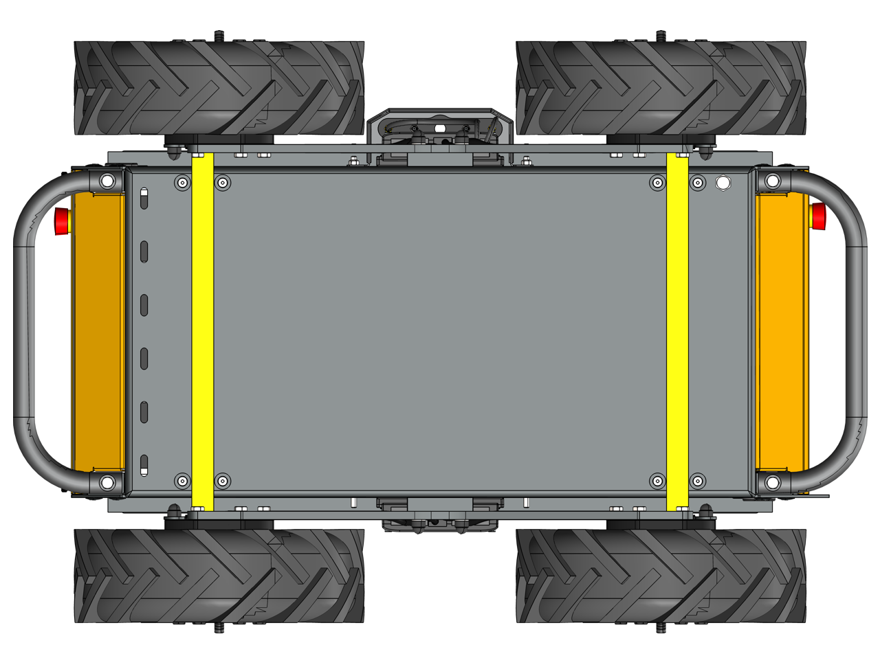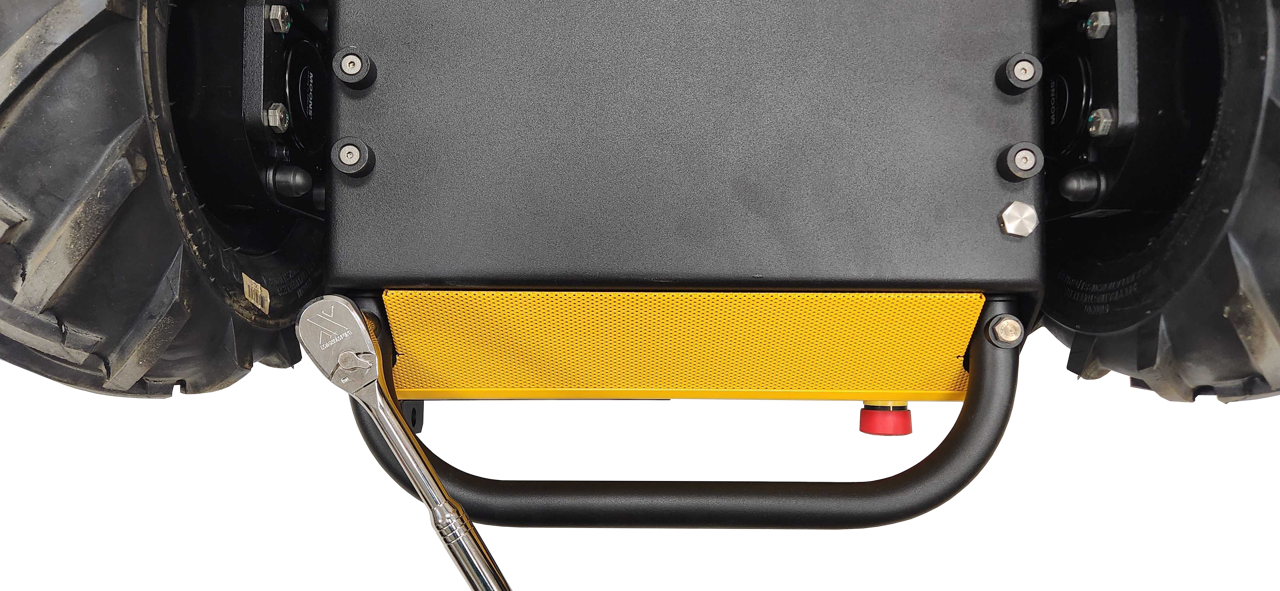 There is a grid of Ø5 mm holes on the top of the enclosure, near the front and rear edges. These holes have a pitch of 80 mm, same as Clearpath's PACS™ system. The holes are located near the enclosure's weld seams, to improve stiffness between the large component and the Husky's wheels.